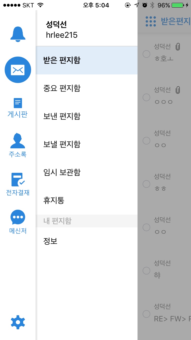 [하이웍스 앱-사내메일 메뉴 화면]