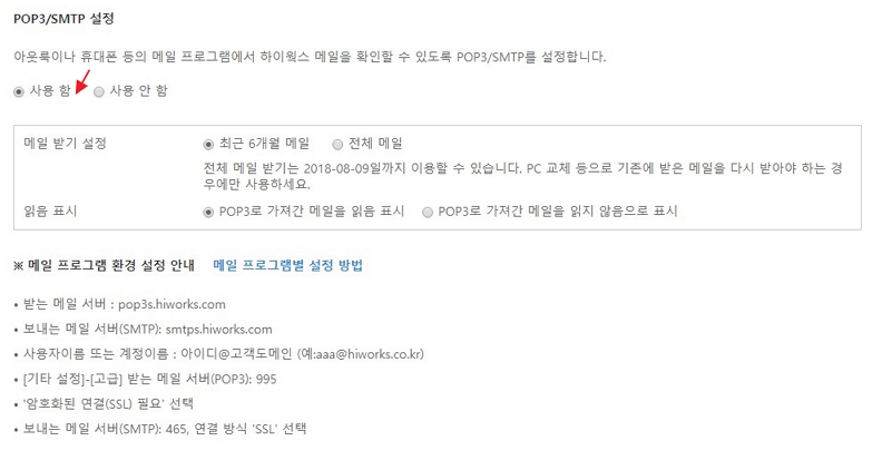 메일프로그램에서의 설정 이전에 하이웍스에 로그인하여, [메일>환경설정>기본 설정] 페이지에서 POP3/SMTP를 사용함으로 설정하세요.