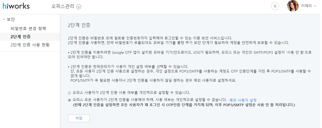 2단계인증을 설정한 후 하이웍스/메신저앱에 1회 재로그인(+OTP인증)해야하며,POP3/SMTP기능을 사용하는 경우 2단계인증을 사용할 수 없습니다.