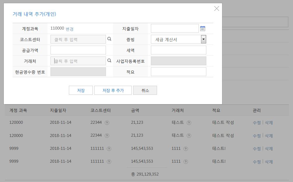 ⊙ 아래와 같이 지출 결의서를 작성할 때 내역 추가 레이어에 등록된 정보를 검색하는 방식을 추가하였으며, 내역 입력 후에 원하는 순서대로 정렬하여 기안할 수 있습니다. 보기 및 인쇄 페이지에도 정렬된 순서대로 노출됩니다.
