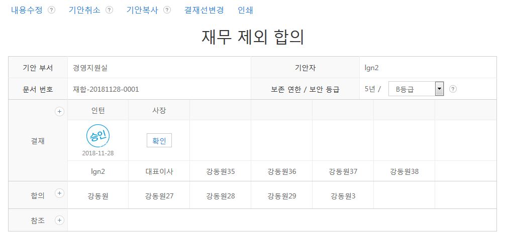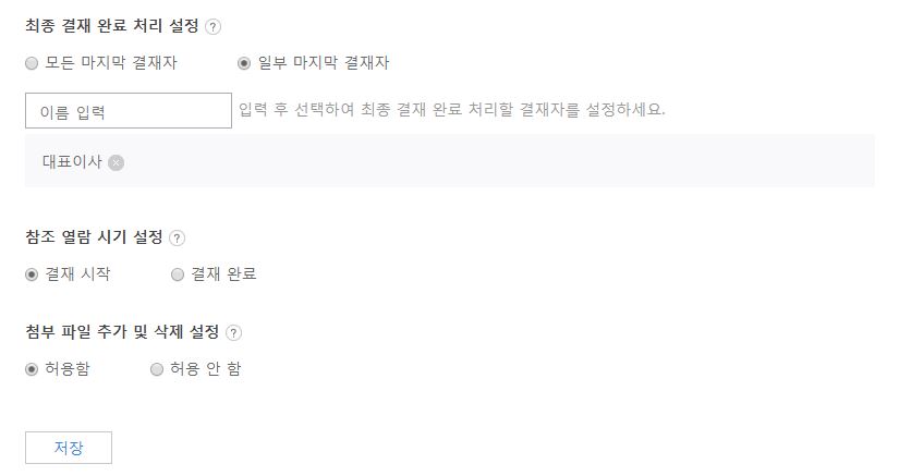 기존에는 모든 마지막 결재자가 합의의 결재가 완료된 후 최종 결재를 할 수 있었지만, 일부 결재자만 최종 결재 완료 처리를 하도록 설정할 수 있습니다. 기본은 모든 마지막 결재자이지만, 아래와 같이 일부 마지막 결재자를 지정하시면 해당하는 사람만 최종 결재자가 됩니다. 지정되지 않은 마지막 결재자는 최종 결재자가 아닌 일반 결재자가 되며, 합의와 재무합의까지 승인해야 최종 결재 완료가 됩니다. 이런 경우 직전까지 결재한 후 마지막 결재자는 예정이 아닌 대기에서 결재할 수 있게 되며, 합의와 재무합의는 결재 예정 상태가 됩니다. 따라서 대표 이사나 회사 내 최종 결정권자만 최종 결재자로 지정하면 이외의 마지막 결재자들은 빠른 의사 표현을 할 수 있습니다.