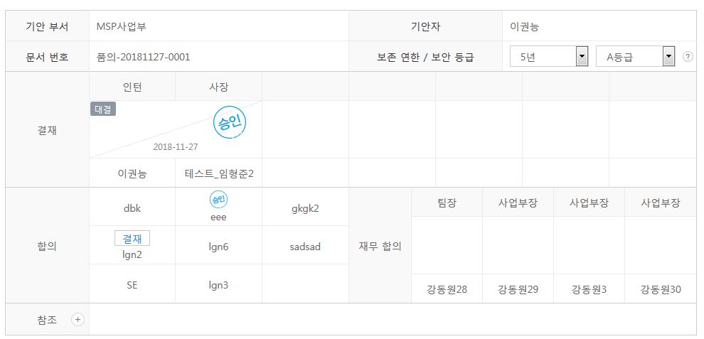 결재-합의-참조로 이루어진 포맷이 추가되었습니다. 양식함 관리 > 양식 생성/수정에서 설정하시어 아래 그림과 같이 활용하실 수 있습니다. 결재 프로세스는 재무만 제외하고 기존과 동일하게 진행됩니다.