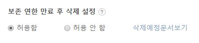 ⊙ 결재 완료된 문서가 보존 연한이 만료된 후 삭제 상태가 되도록 설정할 수 있습니다. 기본은 ‘허용 안 함‘이지만, 삭제를 허용하면 기안일로부터 만으로 해당하는 연수의 다음 해 1월 1일을 기준으로 문서들을 삭제 상태로 변경합니다. ‘허용함‘을 선택한 경우 삭제 예정 문서를 확인할 수 있으며, 선택 후 삭제 예외 처리하면 해당 문서는 삭제 문서 목록에서 복원한 것과 같이 더 이상 자동 삭제되지 않습니다.