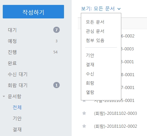 - 모든 목록에 개수를 표시하였으며, 아래와 같이 문서함 > 전체에 구분 필터를 추가하였습니다.