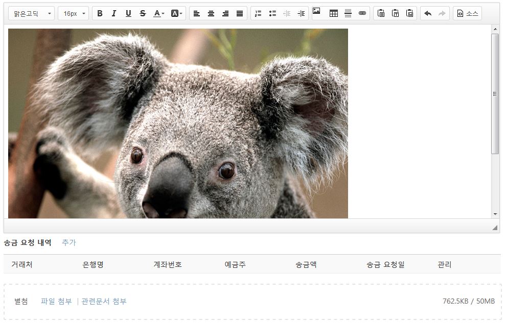 - 에디터 내에서 이미지를 첨부하는 경우, 아래와 같이 첨부 파일 영역에 표시되지 않도록 수정하였습니다. 이처럼 첨부된 이미지는 내용 일부로 취급하기 때문에 일반 첨부 파일과 다르게 기안 복사에 포함됩니다.