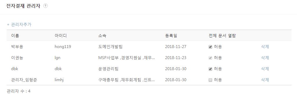관리자 설정 > 전자결재 관리자 메뉴에서 관리자에게 모든 문서에 대한 열람 허용 여부를 설정할 수 있습니다. 전체 관리자는 모든 문서에 대해 기본으로 열람 권한을 갖고 있으며, 전자결재 관리자는 허용 여부를 설정할 수 있습니다. 열람이 허용되면 관리자 설정 > 전체 문서 목록에서 문서 내용을 확인할 수 있으며, 해당 페이지에서는 결재선, 보존 연한/보안 등급, 첨부 파일 등을 변경할 수 없습니다.