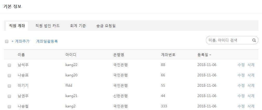 ⊙ 회계 정보 관리 > 기본 정보, 코드 관리에 검색 및 목록 정렬을 추가하였습니다.