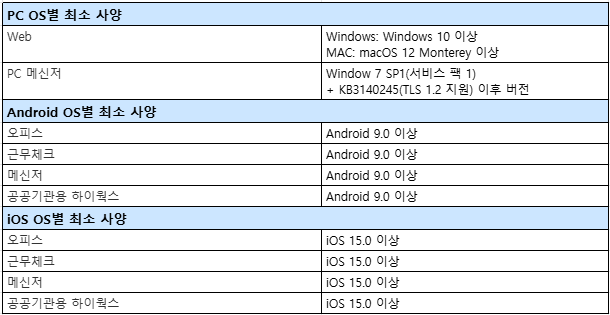 *최소 설치 사양 미만인 OS 사용 시, 기존 설치된 앱을 그대로 사용할 수는 있으나 추후 신규 설치 및 업데이트 불가합니다.