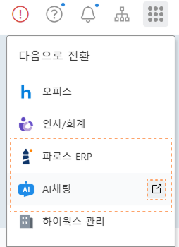 1. 플랫폼 전환 메뉴 영역에 [파로스 ERP]와 [AI 채팅] 메뉴 추가
