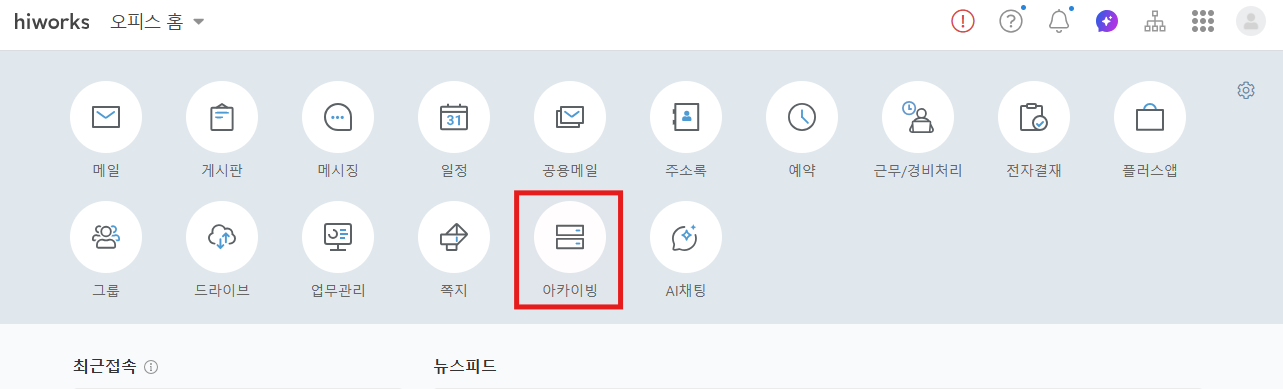 - 아카이빙 관리자로 등록된 사용자는 오피스홈에 '아카이빙' 아이콘이 노출되며, 아이콘 클릭 시 아카이빙 페이지로 이동합니다.