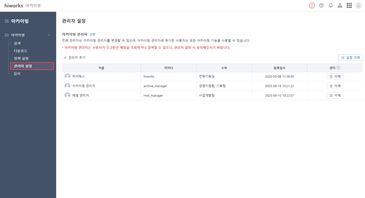 아카이빙 관리자 기능을 통해 원하는 사용자에게 아카이빙 메뉴 접근 권한을 부여할 수 있습니다.