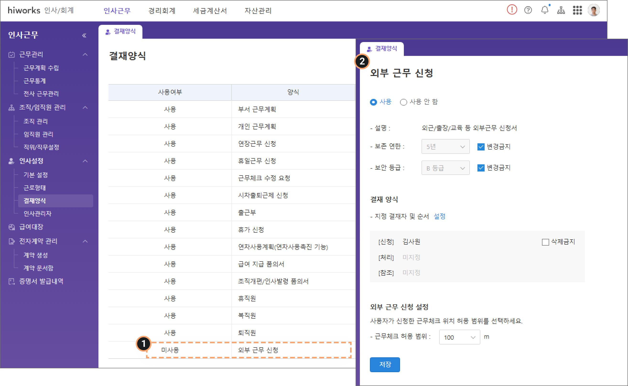 1) [인사근무>인사설정>결재양식]에 외부 근무 신청 양식이 신설됩니다.