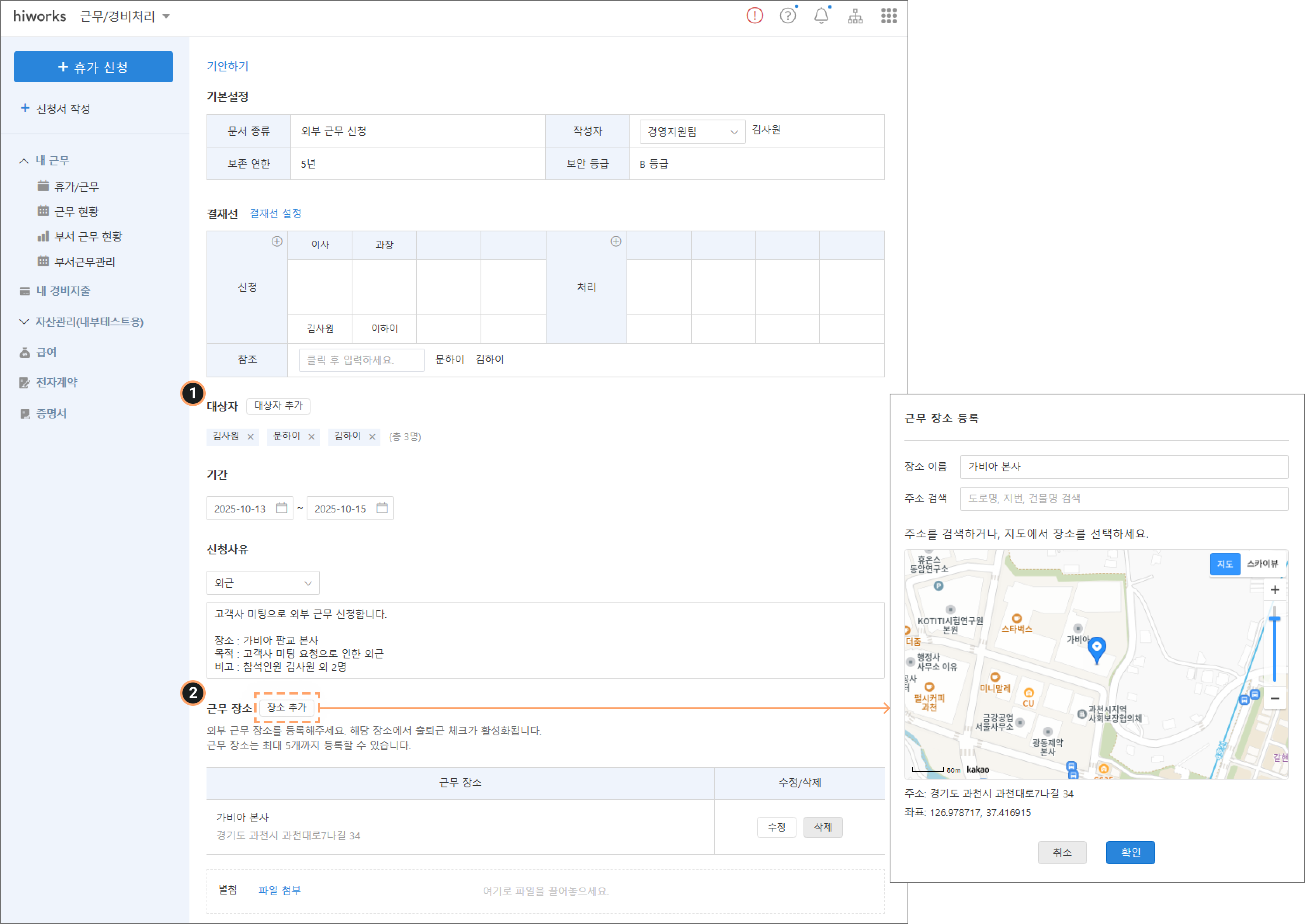 2. '외부 근무 신청' 기능은 직원이 외부 근무체크할 장소를 미리 등록/기안하고 해당 기간에 외부 근무장소 접근 시 근무체크 버튼이 활성화됩니다.
