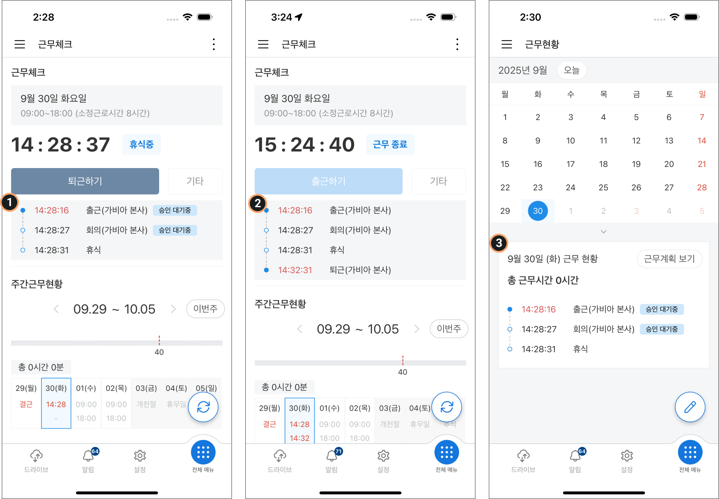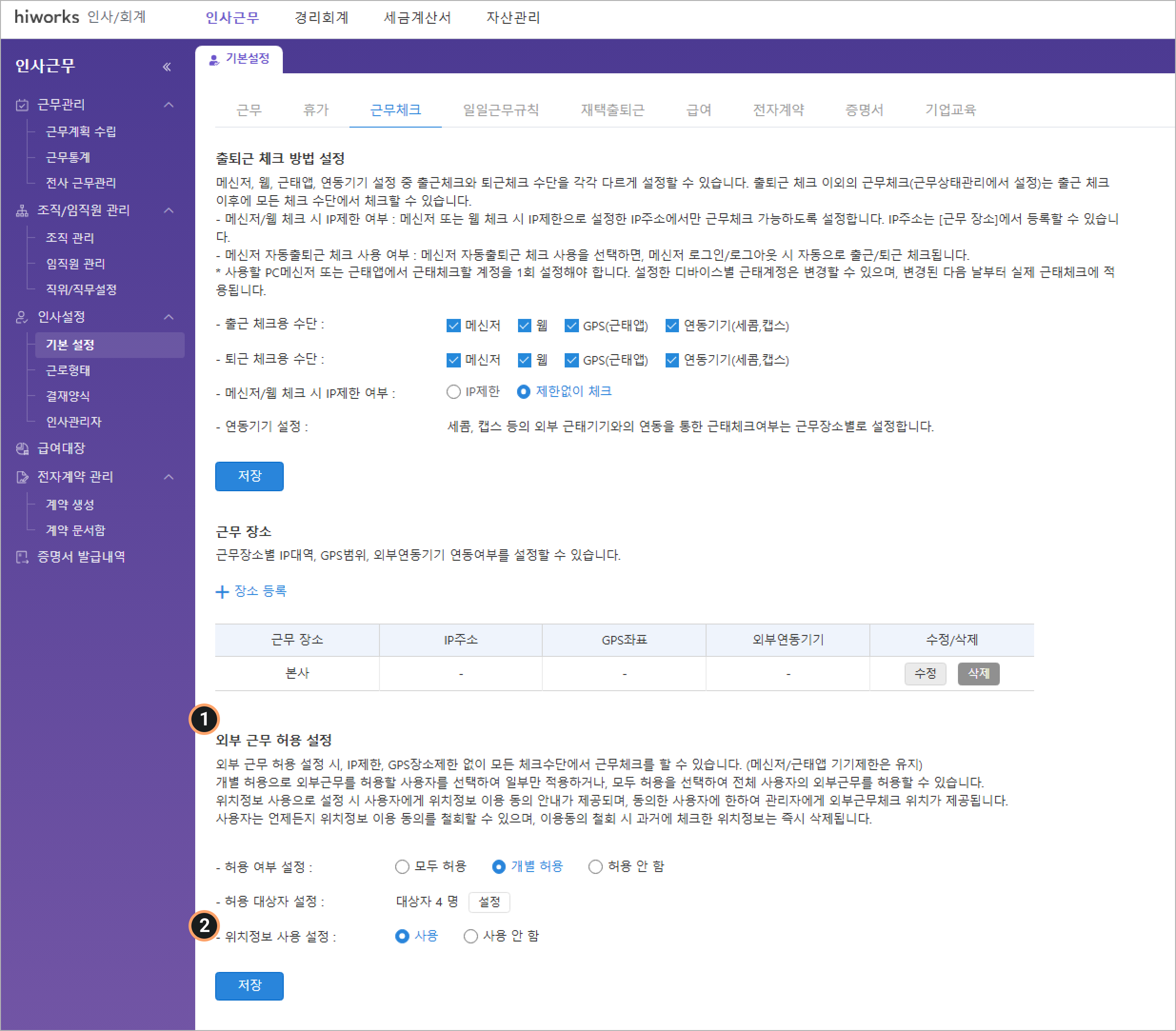 하이웍스 외부 근무체크(GPS)는 2개 기능으로 제공합니다.