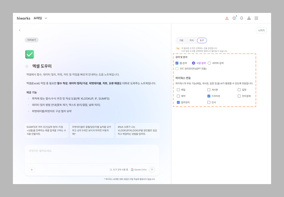 - 하이웍스 도구: 메일, 게시판, 일정, 예약, 드라이브, 전자결재, 업무관리, 인사