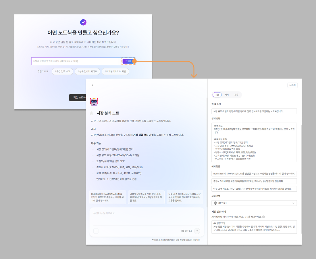 노트북 이름과 설명은 물론, 복잡한 프롬프트까지 AI가 한번에 채워줍니다.
